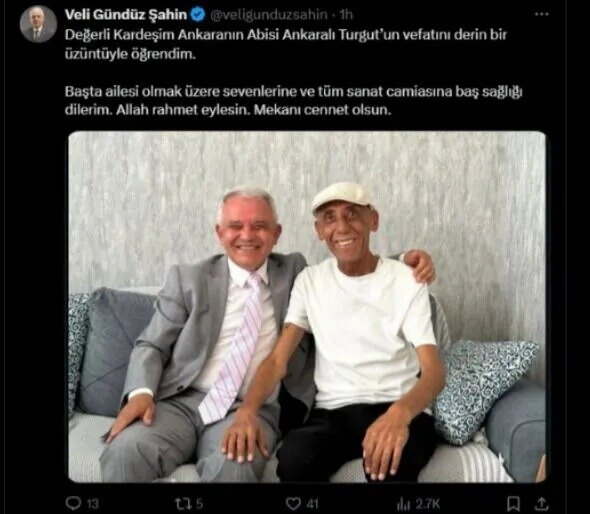 Veli Gündüz Şahin, X hesabından yaptığı paylaşımda şu ifadelere yer verdi: “Değerli Kardeşim, Ankara’nın Abisi Ankaralı Turgut’un vefatını derin bir üzüntüyle öğrendim. Başta ailesi olmak üzere sevenlerine ve tüm sanat camiasına baş sağlığı dilerim. Allah rahmet eylesin. Mekanı cennet olsun.”
