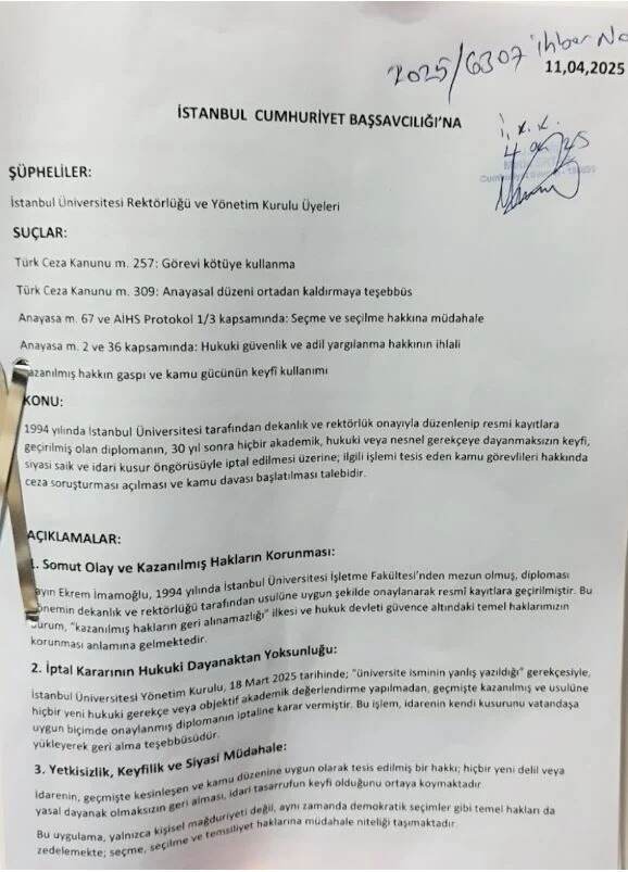 11 Nisan 2025 tarihli suç duyurusu dilekçesinde, İmamoğlu’nun diplomasının 1994 yılında İstanbul Üniversitesi tarafından dekanlık ve rektörlük onayı ile düzenlenip resmi kayıtlara geçirildiği ifade edildi.