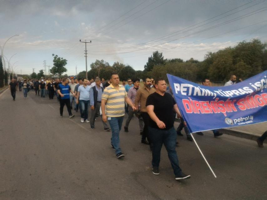 Bu sabah 08:16 vardiyasına gelen Petkim işçisi Tüptaş işçisine destek vermek amacıyla Tüpraş’a kadar yürüdü. Ellerinde; “Petkim Tüpraş İşçisi, Direnişin Simgesi” yazılı pankart taşıyan işçiler, “Birleşe-birleşe kazanacağız” ve “Tüpraş İşçisi yalnız değildir” şeklinde sloganlar atarak yürüyüş kolu düzeninde Tüpraş’a yürüdü.