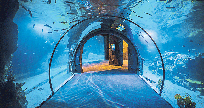 Zeminden başlayan tünel akvaryumda 2 yaşındaki çocuklar da balıkları keyifle izleyebiliyor. Havuz camları üç yetişkin fili taşıyacak güçte. Ziyaretçiler akvaryumdaki balıkları sadece camların arkasından izlemekle kalmıyor, koi balıkları ile vatoz balıklarını biberonla besleyebiliyor. Akvaryum fok sesleriyle ünlü siren kayalıklarıyla başlıyor, 7 tür köpek balığının bulunduğu havuz, korsan gemi batığı, koi balıkları, böcekler ile devam ediyor.