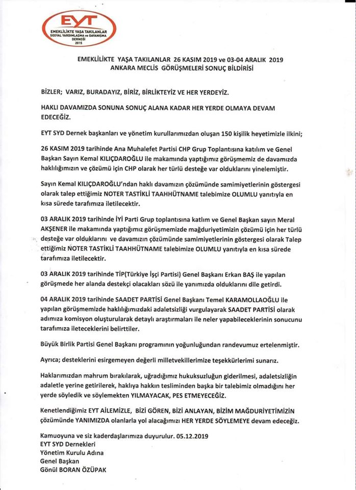 KUZEYEGEHABER-EYTSYD Dernekleri Genel Merkezinden, EYT Heyetinin Ankara’da TBMM’de temsil edilen yada meclis dışında siyasi faaliyette bulunan siyasi parti guruplarıyla yapılan görüşmelere ilişkin sonuç bildirgesi açıklandı. Bildirge şöyle;