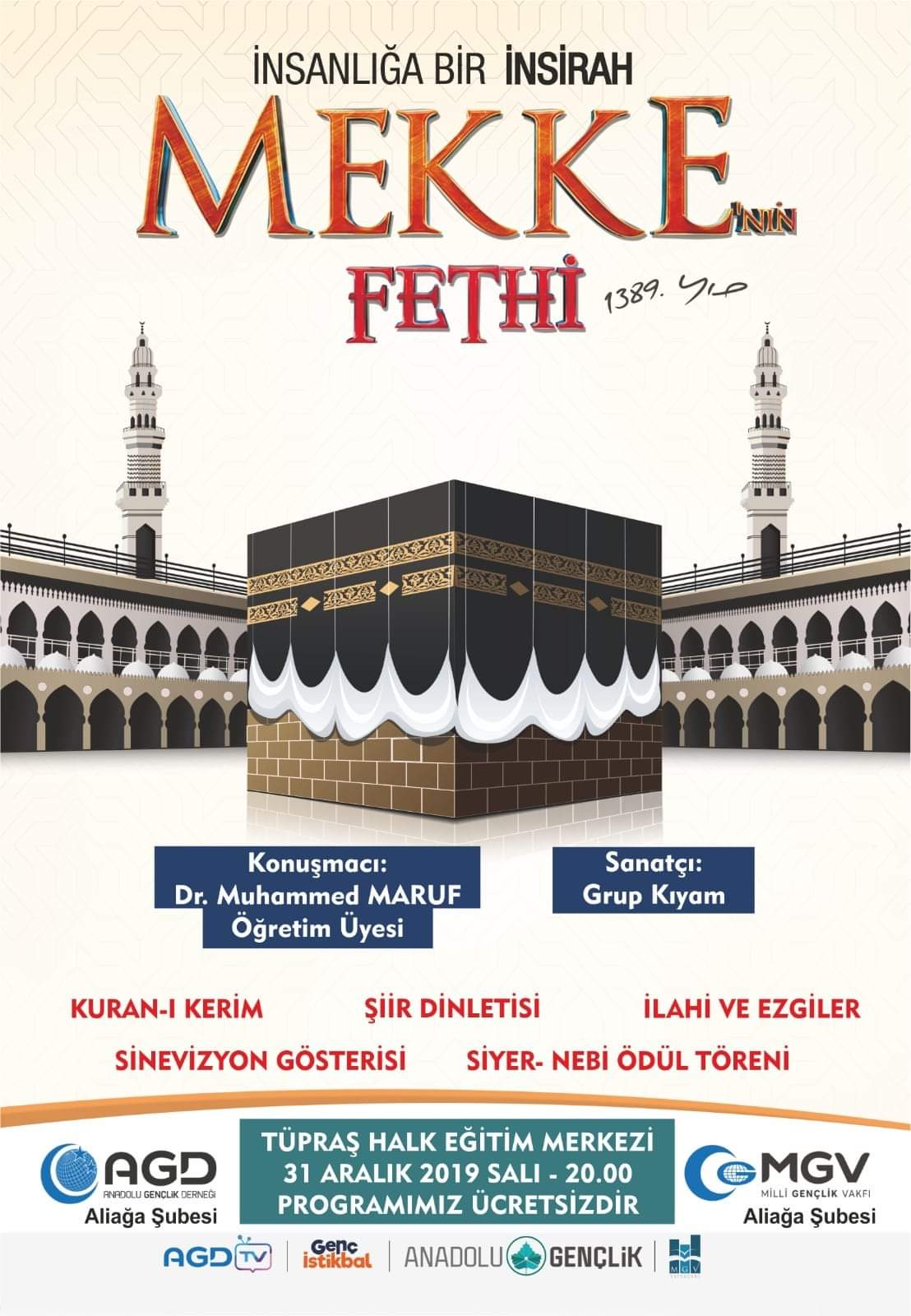 KUZEYEGEHABER-Anadolu Gençlik Derneği (AGD) ile Milli Gençlik Vakfı (MGV) müştereken program düzenliyor. Aliağa Tüpraş Halk Eğitim Merkezinde düzenlenecek olan program; “İnsanlığa Bir İnşirah, Mekke’nin Fethi” ismini taşıyor.