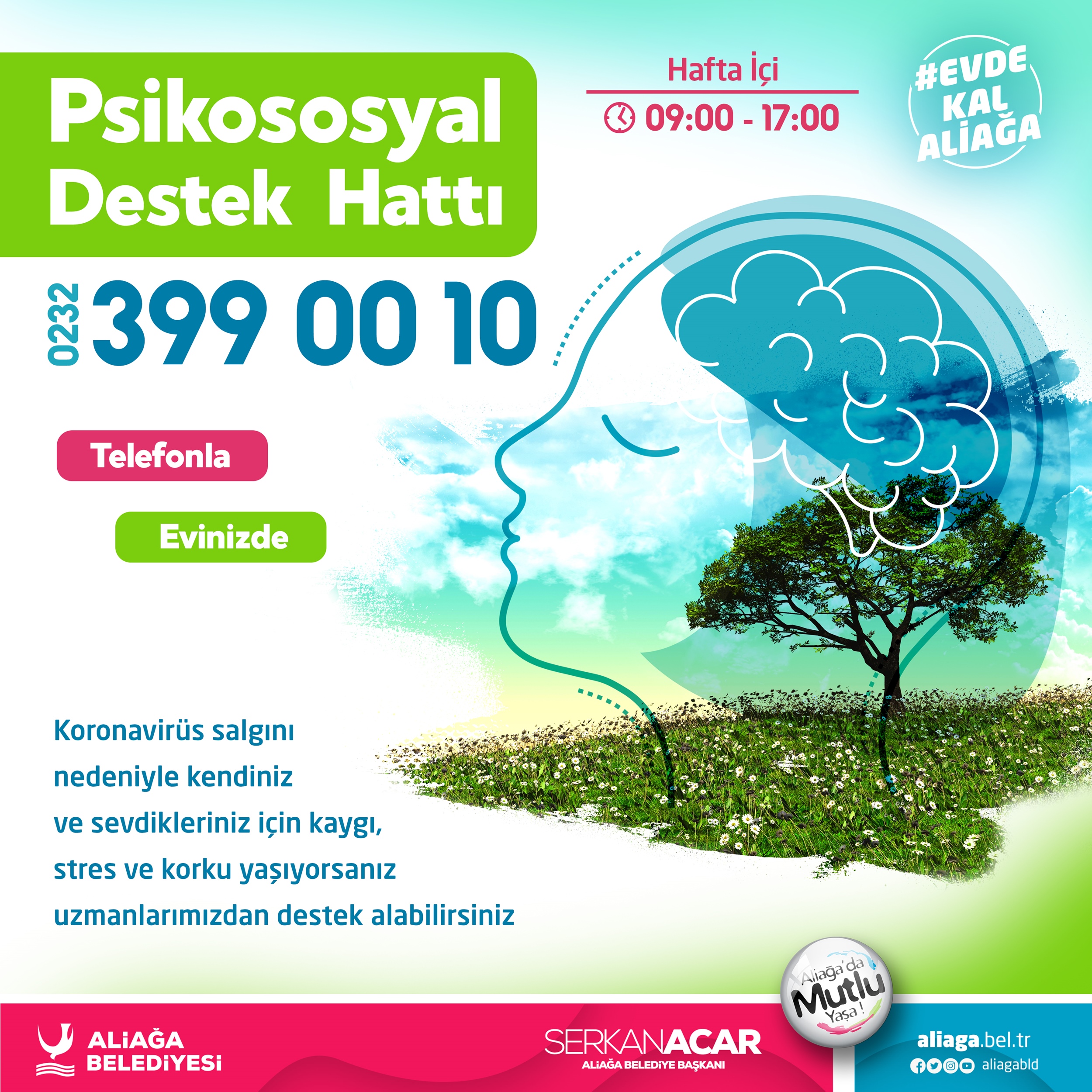 Aliağa Belediyesi sosyal izolasyon yaşayan Aliağa halkının kaygı düzeylerini dengelemek, bilgi kirliliği kaynaklı endişelerini gidermek ve psikolojilerini güçlü tutmalarını sağlamak amacıyla kurulan ‘Psikososyal Destek Hattı’ndan 3 hafta içerisinde çok sayıda vatandaşımız yararlandı.