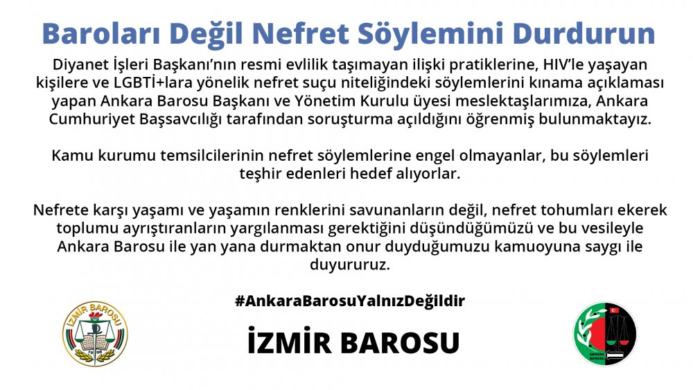 ‘’Diyanet İşleri Başkanı’nın resmi evlilik taşımayan ilişki pratiklerine, HIV’le yaşayan kişilere ve LGBTİ+lara yönelik nefret suçu niteliğindeki söylemlerini kınama açıklaması yapan Ankara Barosu Başkanı ve Yönetim Kurulu üyesi meslektaşlarımıza, Ankara Cumhuriyet Başsavcılığı tarafından soruşturma açıldığını öğrenmiş bulunmaktayız.