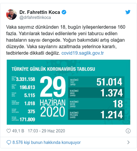 KUZEYEGEHABER-Sağlık Bakanı Dr. Fahrettin Koca bugüne ait koronavirüs verilerini paylaştı. Dün yaptığı gibi tedbirlerde dikkatli değiliz diyen Koca şu ifadeler de bulundu;