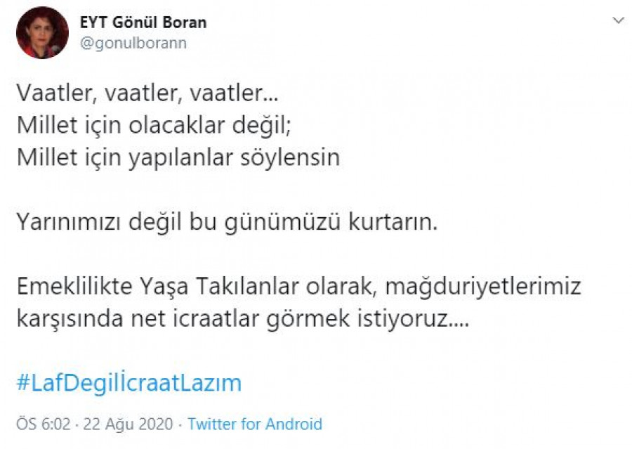 Etkinliği ilk tweet’i atan Marmara Emeklilikte Yaşa Takılanlar Federasyonu ve Emeklilikte Yaşa Takılanlar Derneği Başkanı Gönül Boran Özüpak, şunları söyledi: