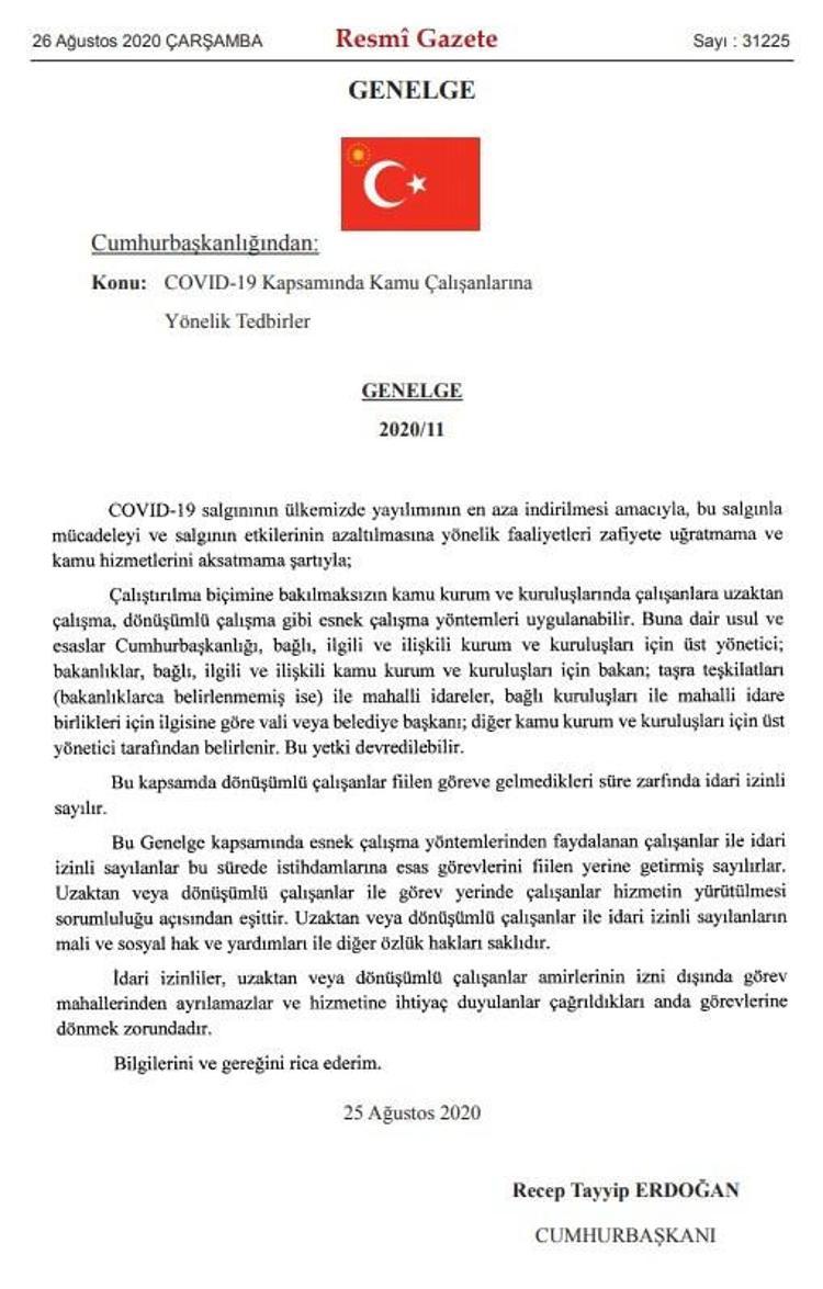 Bugün yayınlanan genelgede ise kamu kurum ve kuruluşlarında çalışanlara uzaktan çalışma, dönüşümlü çalışma gibi esnek çalışma imkanı sağlanacağı bildirildi. İşte, genelgenin tamamı..
