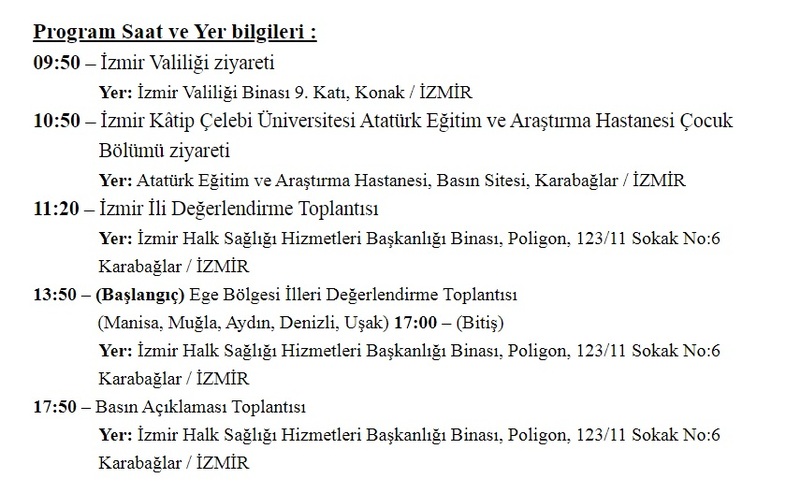 Sağlık Bakanı İzmir’de çeşitli hastane ziyaretleri gerçekleştirerek değerlendirme toplantıları yapacak.17:50’de İzmir Halk Sağlığı Hizmetleri Başkanlığı Binası’nda basın açıklaması gerçekleştirecek.