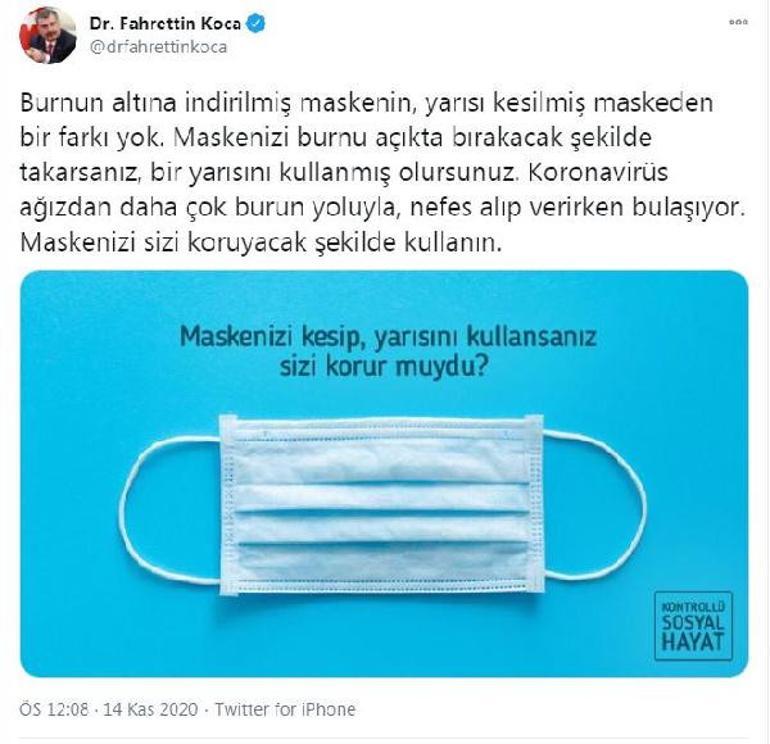 Bakan Koca, “Burnun altına indirilmiş maskenin, yarısı kesilmiş maskeden bir farkı yok. Maskenizi burnu açıkta bırakacak şekilde takarsanız, bir yarısını kullanmış olursunuz.