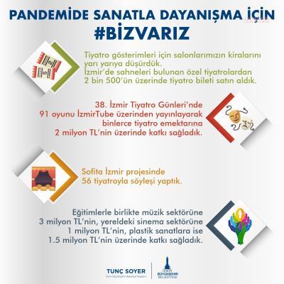 İzmir Büyükşehir Belediye Başkanı Tunç Soyer, pandeminin ikinci dalgası nedeniyle sekteye uğrayan kültür sanat üretiminin devam etmesi ve sıkıntılı günler geçiren sektör emekçilerinin desteklenmesi için iki kademeli bir eylem planı hazırladıklarını açıkladı.