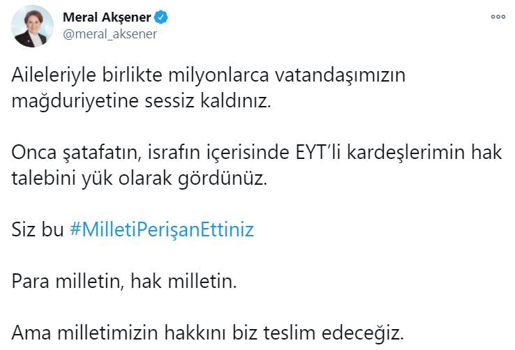 İYİ Parti Genel Başkanı Meral Akşener sosyal medya hesabından, “Aileleriyle birlikte milyonlarca vatandaşımızın mağduriyetine sessiz kaldınız. Onca şatafatın, israfın içerisinde EYT’li kardeşlerimin hak talebini yük olarak gördünüz.