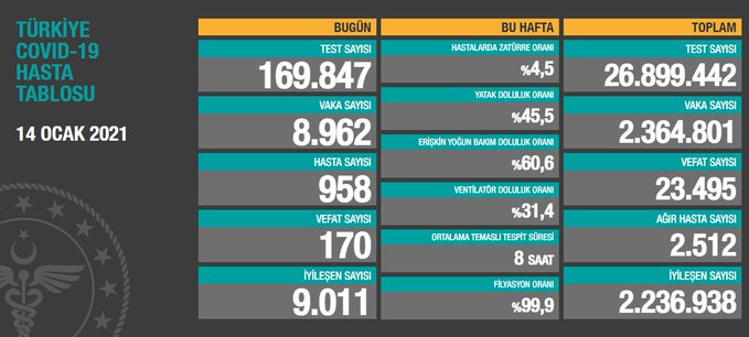 Türkiye’de son 24 saatte yapılan testler sonucuna göre 14 Ocak 2021 tarihi itibariyle 958 kişinin septomlu, 8 bin 962 kişinin semptomsuz olarak koronavirüse yakalandığı belirlendi. Son 24 saatte 170 kişi koronavirüsten yaşamını yitirdi.