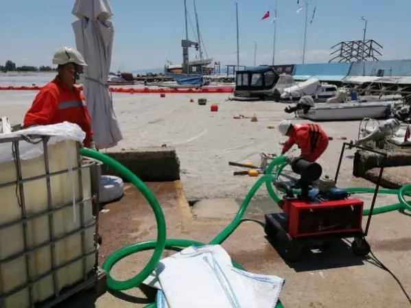 Ekipler, önce sahil kenarındaki tekneleri uzaklaştırdı ardından deniz salyalarını suda çembere aldı. Yüzeydeki deniz salyaları, motorlu pompayla çekildi. Yapılan çalışmalar, havadan dronla görüntülendi..