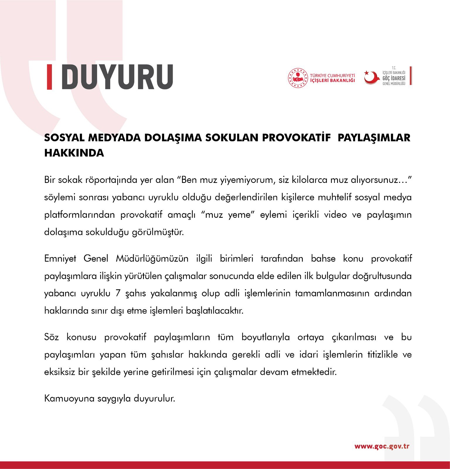 KUZEYEGEHABER-Göç İdaresi Müdürlüğü, son günlerde sosyal medyada yer alan muz yeme videolarına ilişkin açıklama yaptı.