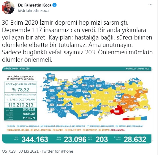 KUZEYEGEHABER-Türkiye’de son 24 saatte 344 bin 163 Kovid-19 testi yapıldı, 23 bin 96 kişinin testi pozitif çıktı, 203 kişi yaşamını yitirdi.
