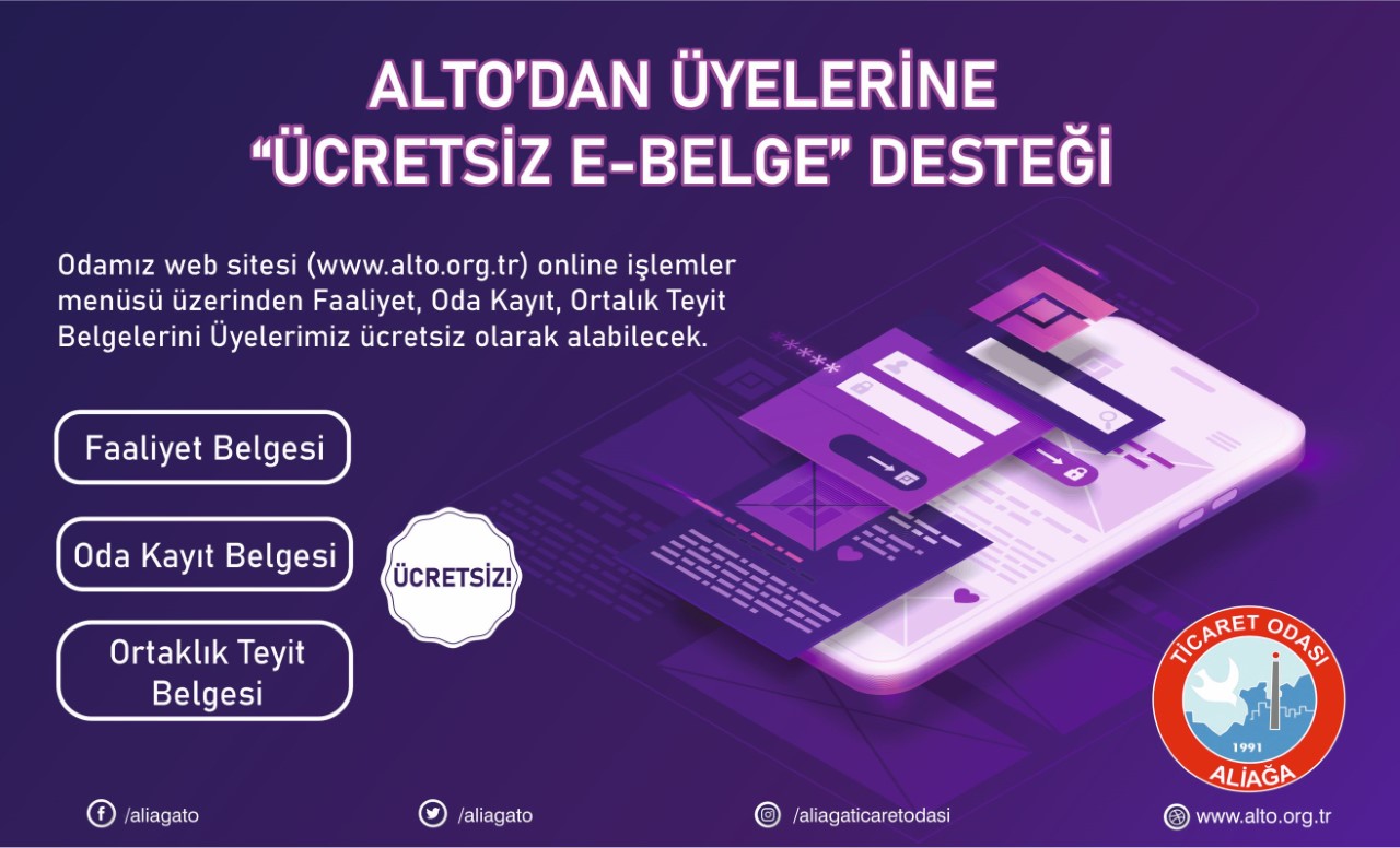 Aliağa Ticaret Odası’nın www.alto.org.tr adresi üzerinden Online İşlemlere giriş yapan ALTO üyeleri, 7/24 E-Belge İşlemlerine tıklayarak istenilen bilgileri doldurup bahse konu e-belgelerini “ücretsiz” olarak alabilecek.