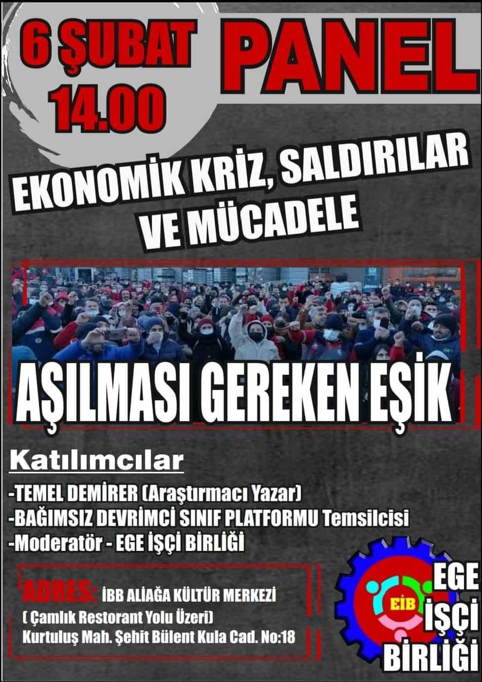 Tüm bu sefalet dayatmasını, baskı ve gericiliği bertaraf etmek için önümüzde AŞILMASI GEREKEN BİR EŞİK bulunuyor. Böylesi bir atmosferde Ege İşçi Birliği olarak işçi sınıfı ve emekçilerle, kadınlarla, gençlerle dayatılan bu kölece yaşam koşullarına karşı sorunların kaynağını tartışacağımız, Aliağa’da neler yapabileceğimizi konuşacağımız bir panel ile yan yana geliyoruz.