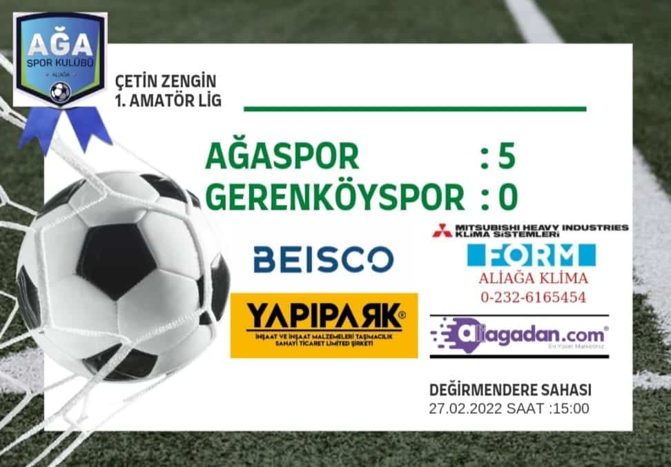 KUZEYEGEHABER-Aliağa’yı Çetin Zengin 1. Amatör küme de temsil eden AĞASPOR kendi sahasında oynadığı Gerenköyspor maçını üstün bir oyun ile 5-0 kazanmasını bildi ve liderlik koltuğuna oturdu.