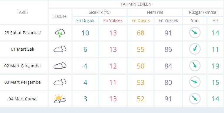 Pazartesi (bugün) termometreler 10’u, Salı günü 6’yı, Çarşamba günü 4’ü, Perşembe günü 4’ü, Cuma günü ise 3’ü gösterecek. 5 günlük hava raporunda yağışın olduğu tek gün ise Pazartesi (bugün) olarak görülüyor..
