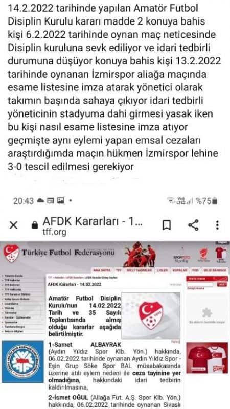Haftada deplasmanda 2-0 yenildiği Aliağa FK müsabakası isim listesine cezalı konumda olan yönetici ve kulüp müdürü İsmet Oğul’un da listeye kaydedildiği belirlendi. Maça gelmemesi gereken cezalı İsmet Oğul’un maça da gelip, üstelik müsabaka isim listesini de imzaladığı tespit edildi.