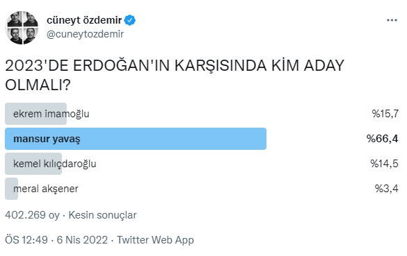 Mansur Yavaş cephesinden konuyla ilgili bir yanıt gelmedi. Gazeteci Cüneyt Özdemir ise, Twitter hesabından bir anket düzenledi.