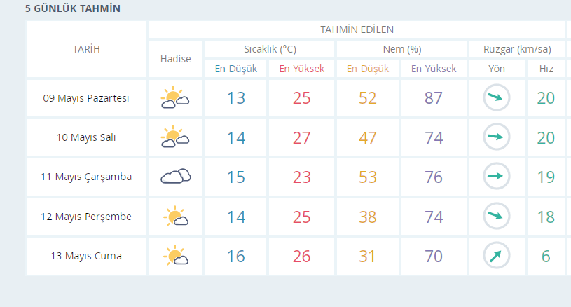 En yüksek nem seviyesinin yüzde 87’ye ulaşması beklenirken, 5 günlük hava raporunda yağış gözükmüyor…
