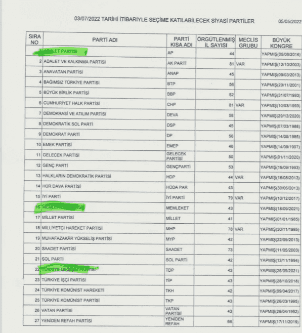 Adalet Partisi, Memleket Partisi ve Türkiye Değişim Partisinin de bu listeye eklenmesiyle seçime girebilecek olan parti sayısı 27’ye yükseldi.