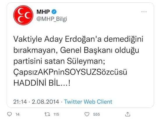MHP resmi Twitter hesabından yapılan paylaşımda, Süleyman Soylu için ”partisini satan” ve ”soysuz” gibi sözlerin kullanıldığı görüldü…