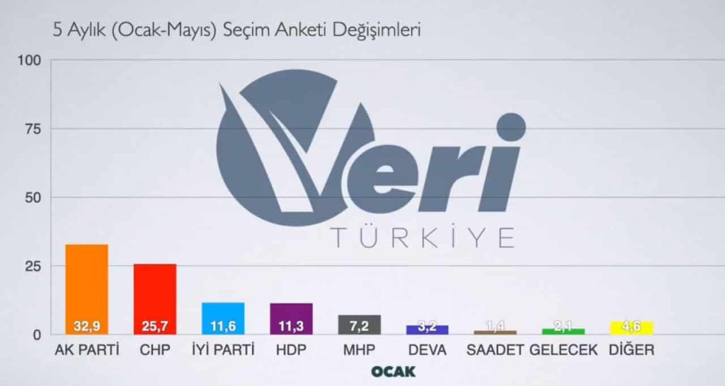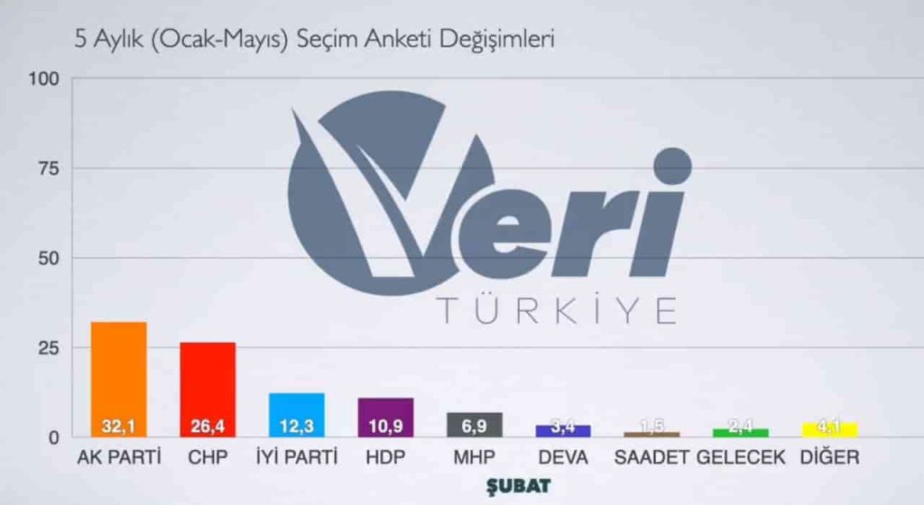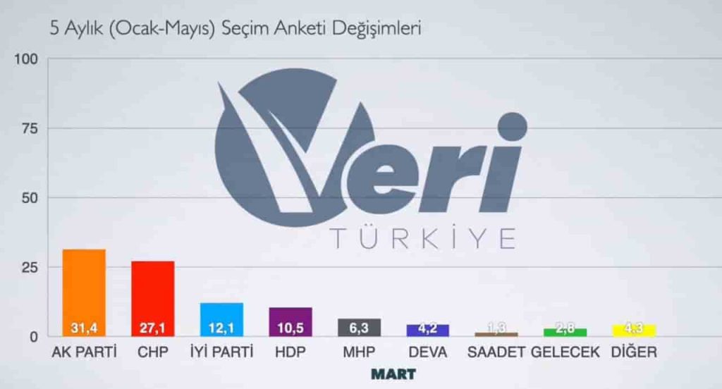 KUZEYEGEHABER-Veri Türkiye, 2022’nin ilk 5 ayında yapılan seçim anketlerinin ortalamalarını yayınladı. Buna göre son anketlerde AKP ve MHP’de düşüş gözlemlendi. 5 aylık periyotta ise anketlerde CHP ve İYİ Parti’nin oylarında artış olduğu görüldü.