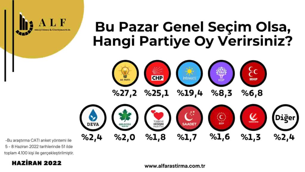 AKP: Yüzde 27,2 CHP: Yüzde 25,1 İyi Parti: Yüzde 19,4 HDP: Yüzde 8,3 MHP: Yüzde 6,8 Gelecek Partisi: Yüzde 2,0 DEVA Partisi: Yüzde 2,4 Saadet Partisi: Yüzde 1,7