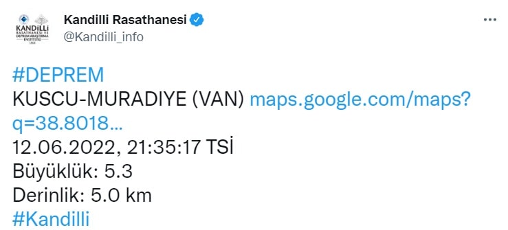 Kandilli Rasathanesi’nden yapılan açıklamada ise depremin büyüklüğünün 5.3 olduğu belirtildi…