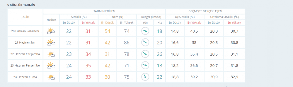 KUZEYEGEHABER-Meteoroloji Genel Müdürlüğü’nün resmi sitesinde yer alan bilgiye göre Pazartesi (bugün) termometreler 31’i, Salı günü 31’i, Çarşamba günü 34’ü, Perşembe günü 35’i, Cuma günü ise 33’ü gösterecek.