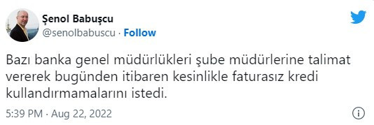 Babuşcu’nun iddiasına göre bazı banka genel müdürlükleri şube müdürlerine bugünden itibaren kesinlikle faturasız kredi kullandırmamaları için emir verdi.