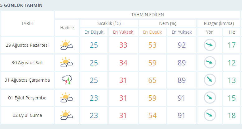 İzmir’de önümüzdeki 5 gün en düşük sıcaklık 31 derece olacak, en yüksek derece ise 33 olacak.