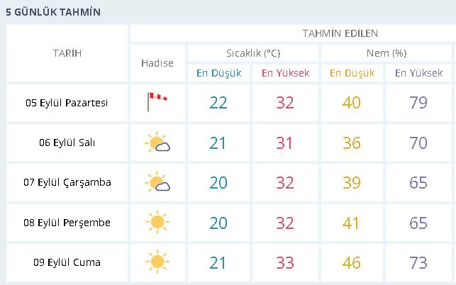 KUZEYEGEHABER- Meteoroloji Genel Müdürlüğü’nün resmi sitesinde yer alan bilgiye göre Pazartesi (bugün) termometreler 32’yi, Salı günü 31’i, Çarşamba günü 32’yi, Perşembe günü 32’yi, Cuma günü ise 33’ü gösterecek.