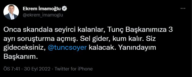 Sosyal medya hesabından paylaşım yapan İmamoğlu, ”Onca skandala seyirci kalanlar, Tunç Başkanımıza 3 ayrı soruşturma açmış. Sel gider, kum kalır. Siz gideceksiniz, Tunç Soyer kalacak. Yanındayım Başkanım” ifadelerini kullandı…