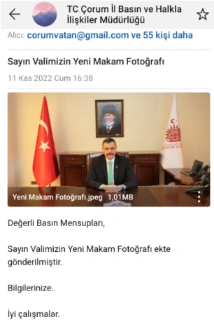 T24’ten Elvan Yılmaz’ın haberine göre, Çorum Valiliği tarafından yerel basına gönderilen e-postada, “Değerli basın mensupları, Sayın valimizin yeni makam fotoğrafı ekte gönderilmiştir, bilginize” denildi.
