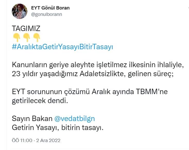 “#AralıktaGetirYasayıBitirTasayı Kanunların geriye aleyhte işletilmez ilkesinin ihlaliyle, 23 yıldır yaşadığımız Adaletsizlikte, gelinen süreç; EYT sorununun çözümü Aralık ayında TBMM’ne getirilecek dendi. Sayın Bakan @vedatbilgn