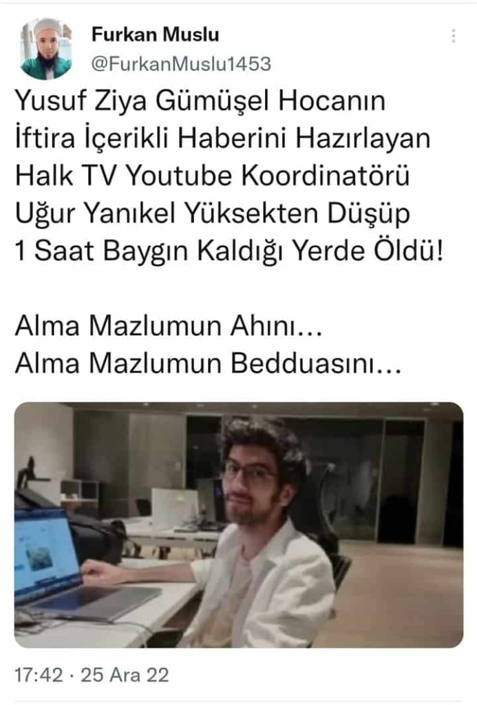 KUZEYEGEHABER-İsmailağa Cemaati’nden Furkan Muslu, hayatını kaybeden Halk TV çalışanı Uğur Yanıkel’i hedef aldı.