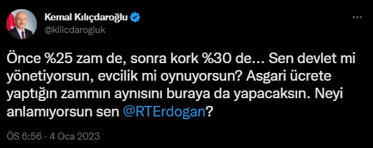 Yüzde 25 olarak açıklanan memur ve emekli maaş oranlarındaki zammın yüzde 30’a çıkarılmasıyla ilgili Erdoğan’a “Sen devlet mi yönetiyorsun, evcilik mi oynuyorsun?” diye soran Kılıçdaroğlu, paylaşımında şöyle dedi: