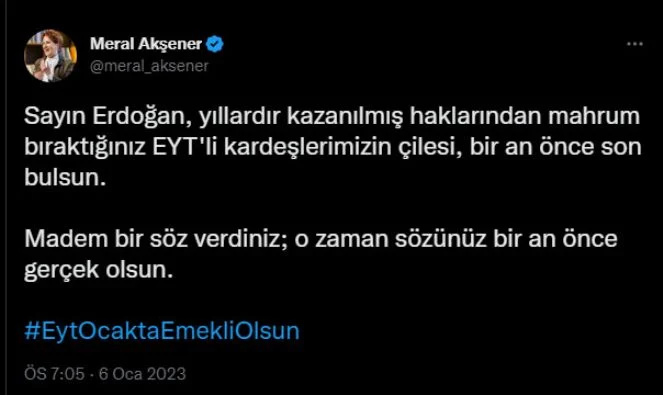 İyi Parti Genel Başkanı Akşener, bu ay TBMM’ye sunulması beklenen emeklilikte yaşa takılanlara emeklilik hakkı düzenlemesinin hızlandırılması amacıyla sosyal medyadan açıklama yaptı. Akşener’in mesajı şöyle:
