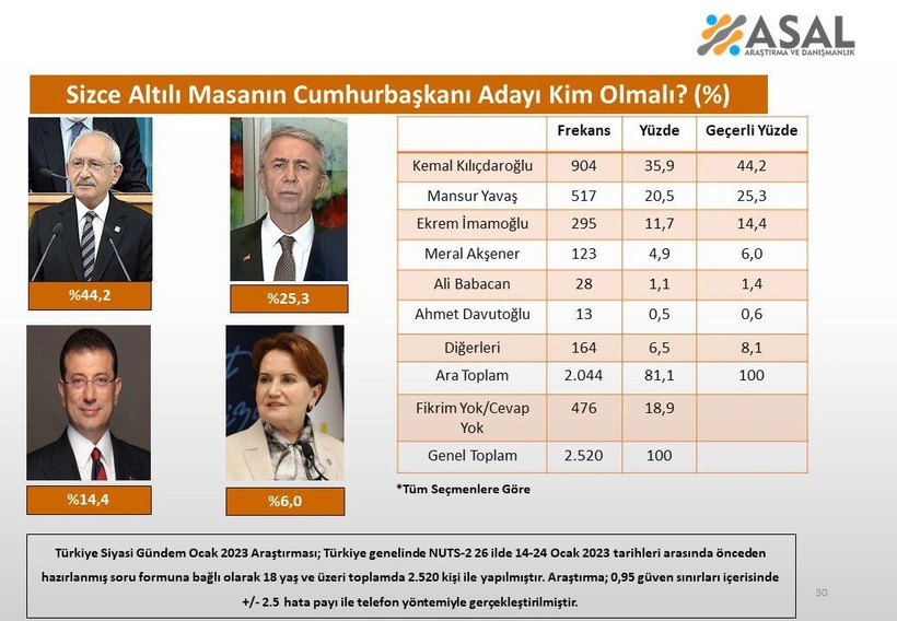 Asal Araştırma, seçmene, ‘Altılı Masa’nın Cumhurbaşkanı Adayı Kim Olmalı?’ diye sorarken, CHP lideri Kemal Kılıçdaroğlu ilk sırada yer aldı.