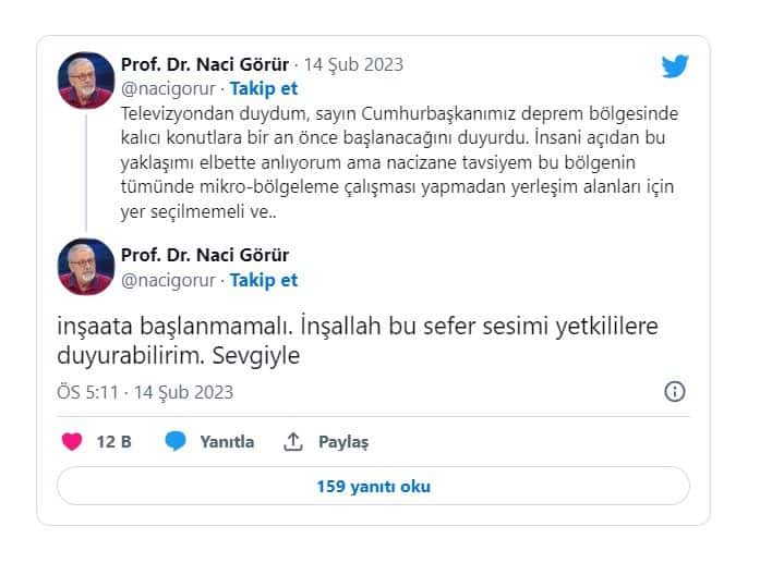 Görür, “İnsani açıdan bu yaklaşımı elbette anlıyorum ama naçizane tavsiyem bu bölgenin tümünde mikro-bölgeleme çalışması yapmadan yerleşim alanları için yer seçilmemeli ve inşaata başlanmamalı. İnşallah bu sefer sesimi yetkililere duyurabilirim. Sevgiyle” dedi…