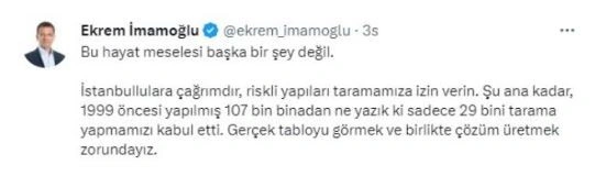 “Bu hayat meselesi başka bir şey değil. İstanbullulara çağrımdır, riskli yapıları taramamıza izin verin. Şu ana kadar, 1999 öncesi yapılmış 107 bin binadan ne yazık ki sadece 29 bini tarama yapmamızı kabul etti. Gerçek tabloyu görmek ve birlikte çözüm üretmek zorundayız…”