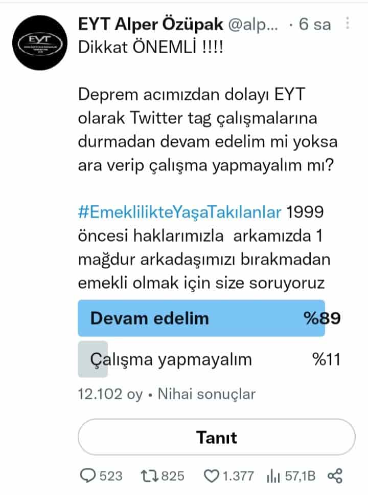 Twitter hesabı üzerinden anket yayınlayan Özüpak, “Dikkat ÖNEMLİ !!!! Deprem acımızdan dolayı EYT olarak Twitter tag çalışmalarına durmadan devam edelim mi yoksa ara verip çalışma yapmayalım mı? #EmeklilikteYaşaTakılanIar 1999 öncesi haklarımızla arkamızda 1 mağdur arkadaşımızı bırakmadan emekli olmak için size soruyoruz” notunu düşmüştü.