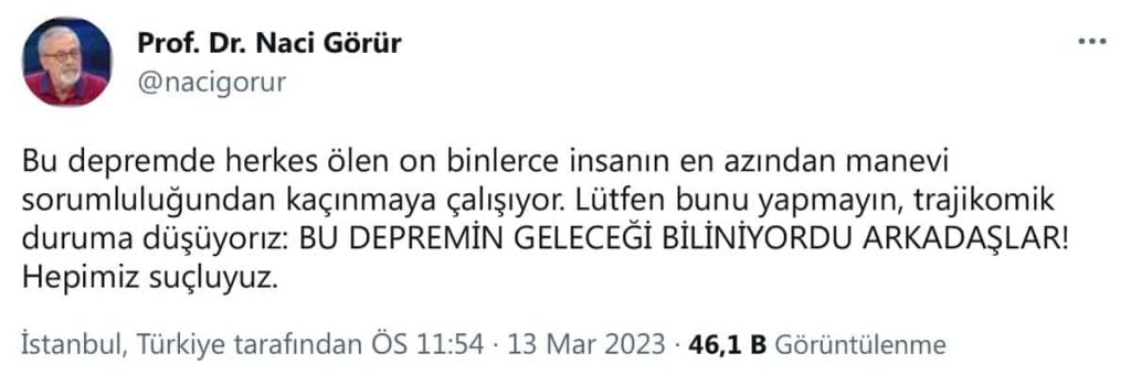 “Bu depremde herkes ölen on binlerce insanın en azından manevi sorumluluğundan kaçınmaya çalışıyor. Lütfen bunu yapmayın, trajikomik duruma düşüyoruz: Bu depremin geleceği biliniyordu arkadaşlar! Hepimiz suçluyuz…”