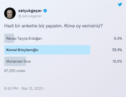 Twitter’da 500 bini aşkın takipçisi bulunan Selçuk Geçer’in hesabından “Kime oy verirsiniz?” başlıklı bir anket açıldı.