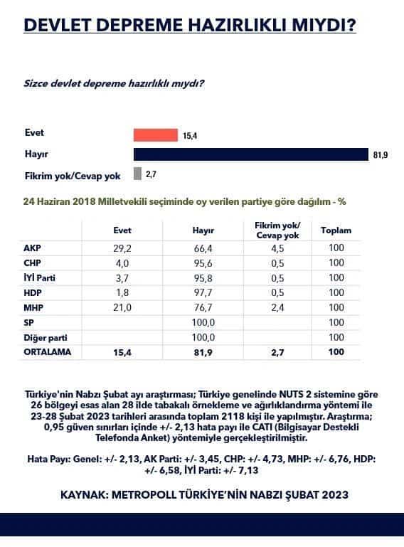 KUZEYEGEHABER-MetroPOLL Araştırma, 23-28 Şubat tarihleri arasında toplam 2118 kişi ile gerçekleştirilen ankette katılımcılara, “Sizce devlet depreme hazırlıklı mıydı?” sorusunu sordu.