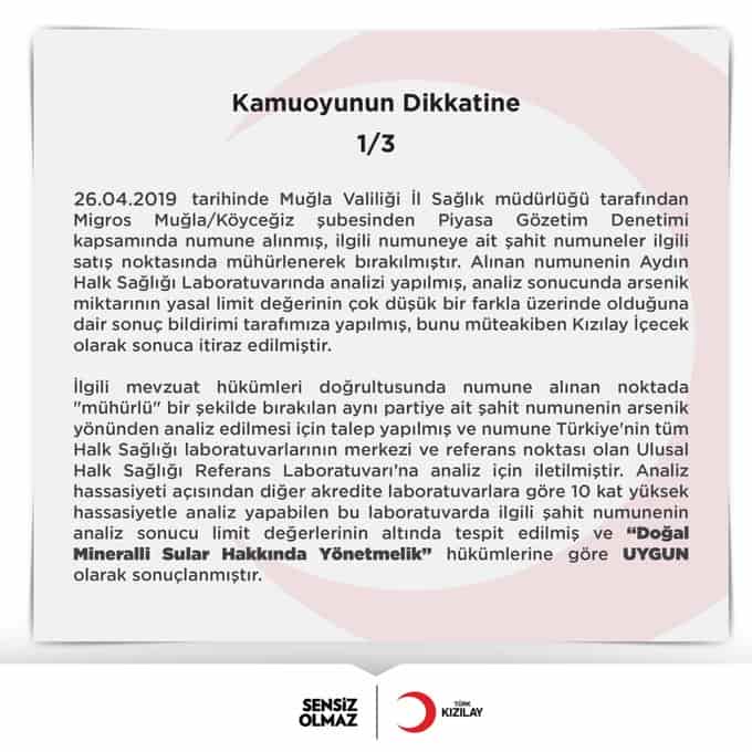 Kızılay’dan yapılan açıklamada ise ilk rapora yapılan itiraz sonucunda numunelerde yeniden inceleme yapıldığı, arsenik değerinin belirlenen limitlerin altında olduğuna dair yeni rapor düzenlendiği belirtilmişti…