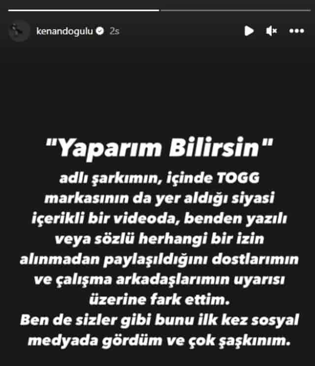 “Yaparım Bilirsin” adlı şarkımın, içinde TOGG markasının da yer aldığı siyasi içerikli bir videoda, benden yazılı veya sözlü herhangi bir izin alınmadan paylaşıldığını dostlarımın ve çalışma arkadaşlarımın uyarısı üzerine fark ettim. Ben de sizler gibi bunu ilk kez sosyal medyada gördüm ve çok şaşkınım…”
